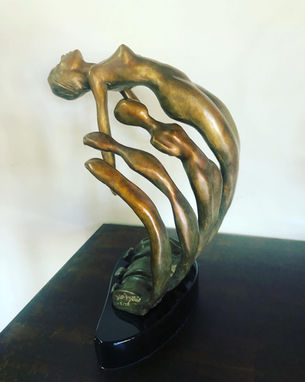 "Evolution of a Woman," limited edition bronze casting of 28, is inspired by the story of Adam and Eve. In the biblical account of creation, woman (Eve) is formed from Adam's rib. I hadn't been to church or read the Bible for a while, but one day, for no particular reason, I found myself asking "Why a rib?" and I was immediately struck by the very romantic idea that our original purpose was to be protectors of the heart: to guard it, hold it and keep it safe. This thought was so beautiful it brought an image with it, that was quickly set to paper, and months later shaped in clay. The forms coming into focus is my whimsical way of combining the creation story with evolution theory.